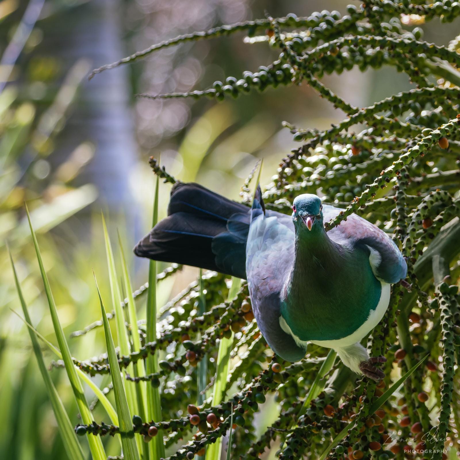 Tui enjoying flax flowers