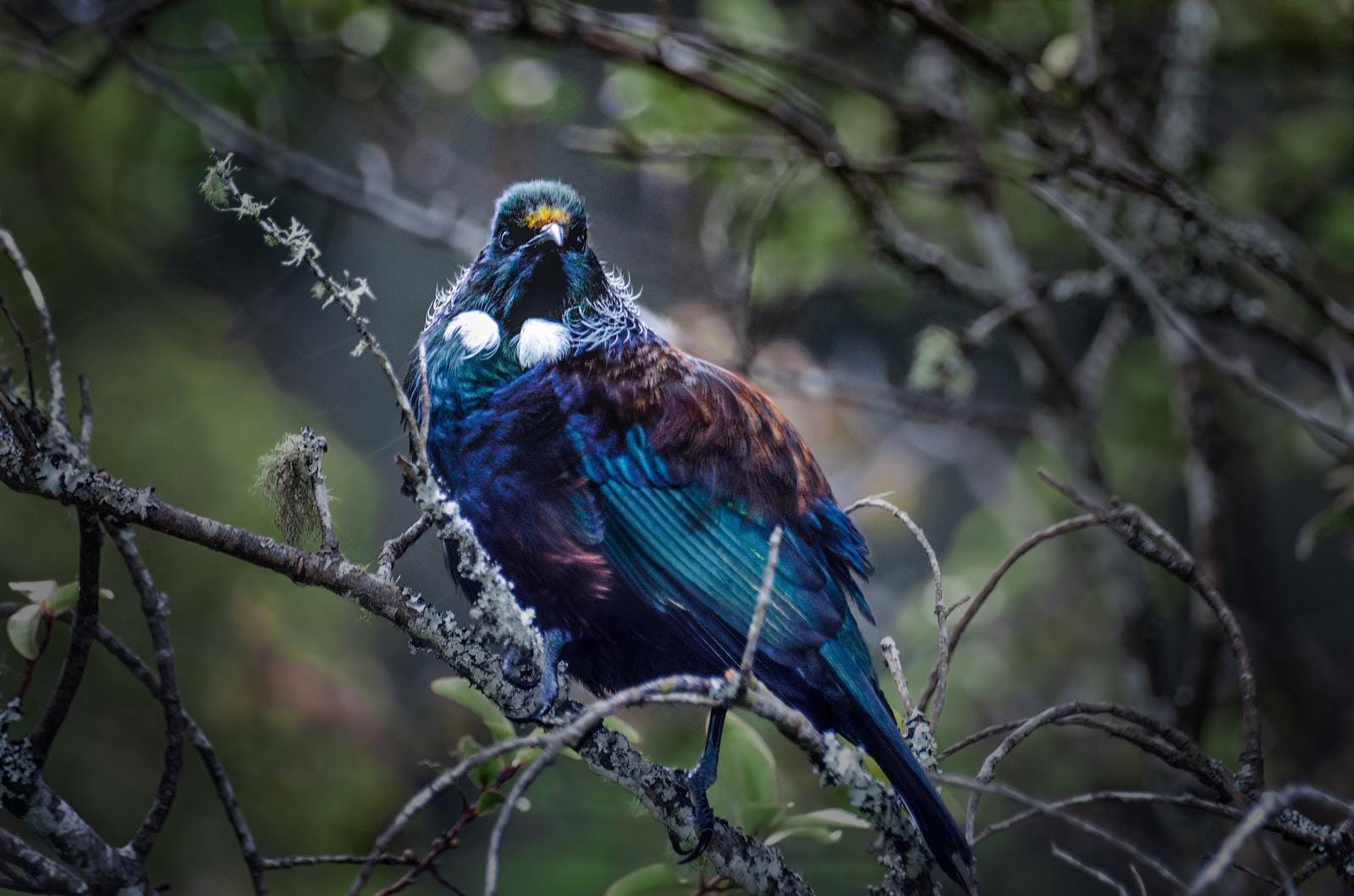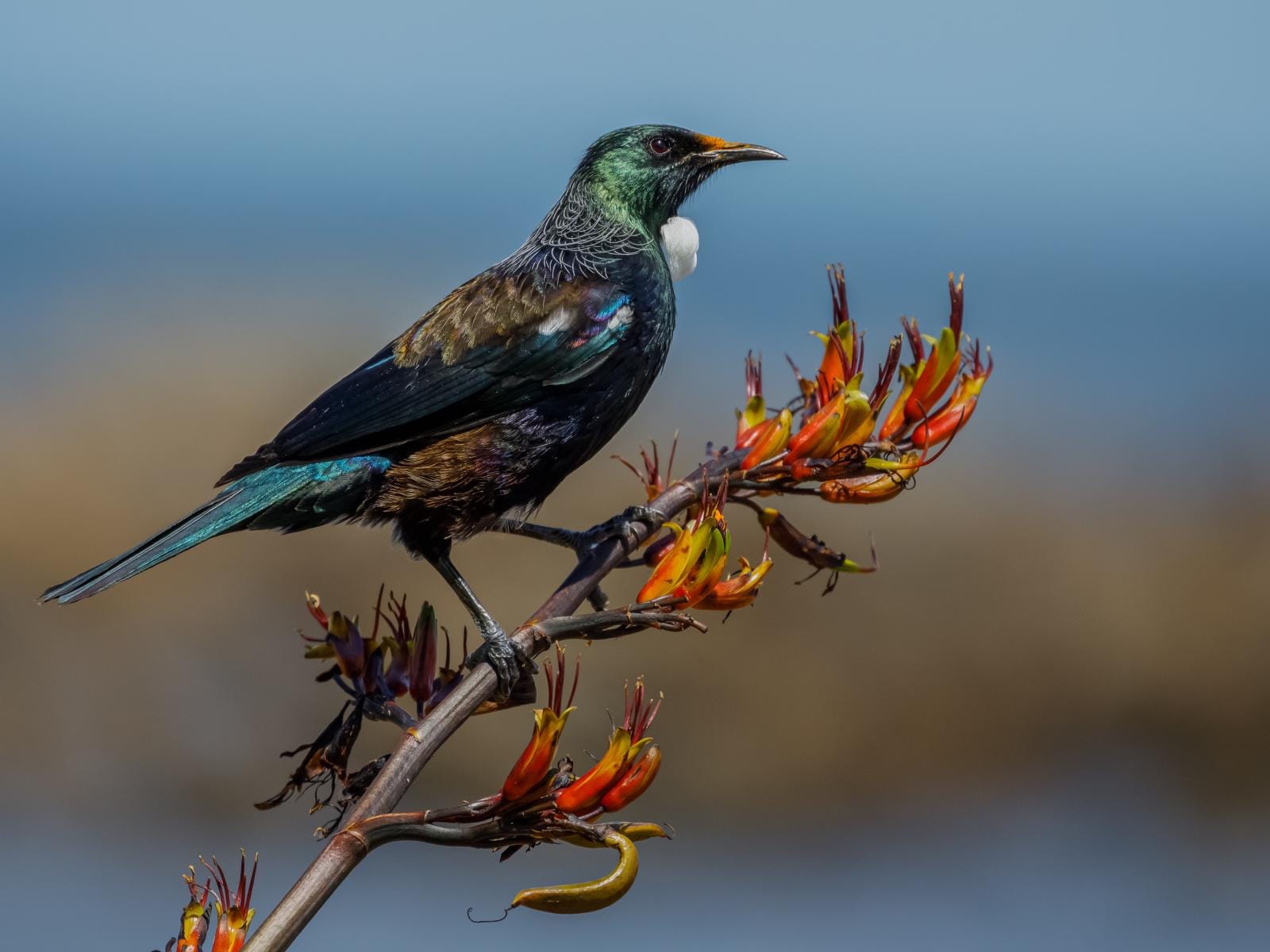 Tui amongst a bounty of Harakeke